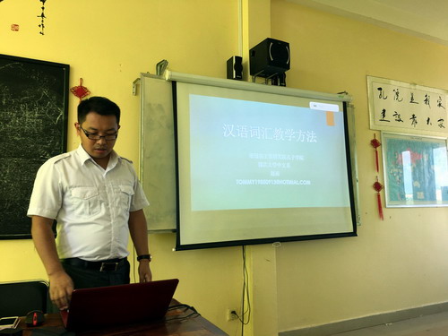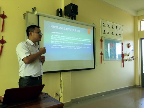 本次研讨会围绕“汉语词汇教学方法”这一主题展开,赵雨老师作为主讲人,就对外汉语的词汇教学进行了详细讲解,其中包括词汇教学的基本原则、词汇教学在课堂上的具体实施等。讲解过程中,赵雨老师针对对外汉语教学课堂的不同情况以及汉语自身的特点,将自己多年对外汉语教学的心得和经验与各位老师分享。老师们积极提出自己在教学过程中的疑惑、想法以及相应的解决策略,会场讨论氛围热烈。