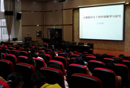 报告会特邀了外国语学院原党委书记万志祥老师作为主讲人,他以《大数据冲击下的外语教育与研究》为题为学院“学术活动月”拉开帷幕。报告中万志祥与在场的各位教师分享了大数据时期对我们生活的影响。他针对我们外院教师提出建议:外语教师要提高自己应对大数据冲击的能力。作为教学督导员,万老师用举例说明的形式总结五点个人体会并和在场教师产生互动。讲座中万老师儒雅的气度、严谨的论证、渊博的知识、风趣的语言都给我院老师留下了深刻的印象。