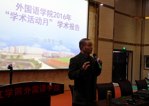 按照学校“学术活动月”的部署,11月12日下午,外国语学院在香远楼三楼报告厅举行“学术活动月”首场学术报告。活动由外国语学院副院长柴克清主持,外国语学院院长韩琨、党委书记杨杰出席,全体教师参加了本次学术报告会。