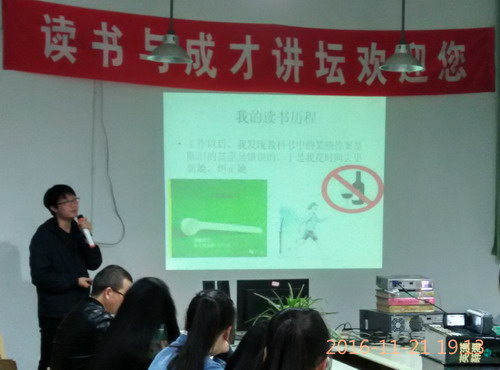 为了将图书馆阅读推广活动推向深入,让广大学子在大学环境中激发梦想,树立人生目标,同时正确理解读书与成才的密切关系。11月21日晚,浔东分馆在二楼听音室举办“读书与成长”公益讲坛暨启动活动,由浔东分馆副主任龚金林老师主持,来自基础医学院、药生学院、护理学院120余名同学参加。第一期讲坛题目是“读书与成才之我见”,主讲嘉宾为我校基础医学院社会医学与公共卫生教研室的杨万水博士,杨博士毕业于复旦大学,是多项国家和省自然科学基金的主持者,发表SCI论文20余篇,先后担任多个国际英文期刊的审稿人。