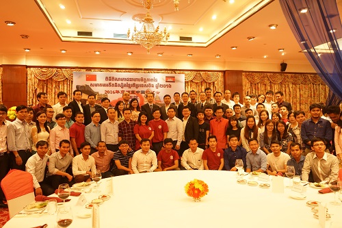 12月11日晚,2016柬埔寨中国校友会联谊晚会在金边洲际酒店举行,晚会由柬埔寨中国校友会主办、柬埔寨孔子学院协办。中国驻柬埔寨大使馆大使熊波、参赞檀勍生,柬埔寨索安副首相助理兼内阁事务部部长助理、校友会会长钱明光(Prak Phannara)、总理府人事局副局长、校友会代会长娜丽(Svay Nakry)、柬埔寨劳工部副秘书长、校友会秘书长鲁卡帕(Tes Rukhaphal)、柬埔寨孔子学院中方院长夏修龙等出席晚会,柬中校友会新老成员、中资公司代表、柬埔寨孔子学院本部志愿者教师参加了晚会。