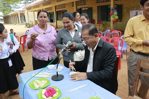 2016年12月31日上午,柬埔寨孔子学院柏威夏省汉语中心开展了“喜迎新春包饺子”中国文化体验活动,柏威夏省商务厅副厅长潘桑安(Phan Sam Ang)先生、谢辛德拜棉芷中学校长包李兴(Peou Lyheang)先生分别致辞。谢辛德拜棉芷中学副校长彭本金(Bun Penkeang)先生、副校长苏思农(Sok Sineoun)女士及300多师生参加了此次活动。