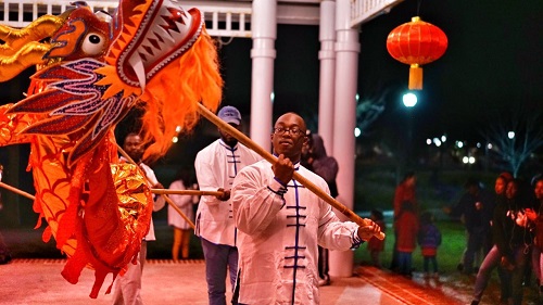 1月30日,近百名在校师生和社区民众聚集在萨凡纳州立大学的露天观景台里,一同欣赏孔子学院举办的“红红火火闹新春”2017烟火秀和舞龙表演。孔子学院中外方院长分别向大家致新春贺辞,中方院长罗其娟向来宾们介绍了中国十二生肖和春节民俗。随后,绚丽多彩的烟花在校园上空绽放,大家无不感叹这场烟火秀的美丽与精彩,孔子学院的学生们兴奋地用汉语说“新春快乐”、“我给你拜年”、“恭喜发财”等春节祝福。将此次庆祝活动推向高潮的则是独具中国特色的传统春节民俗——舞龙。十位来自萨凡纳州立大学的学生身着中国传统服饰,伴着欢快喜庆的锣鼓声,挥舞着手中的巨龙,腾空跃动的长龙不仅在视觉上给人以震撼和享受,更预示着在新的一年里风调雨顺、吉祥如意。来宾们纷纷表示,这是一次独一无二的中国春节体验,在丰富当地大学文化活动的同时,也进一步传播了中国传统文化,让更多人听到了“中国故事”。