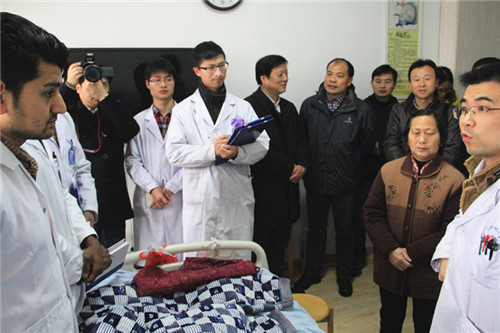 帅式毅一行在临床医学院/附属医院张志平院长的带领下检查了留学生临床带教情况,在消化内科的教学查房过程中,童明富主治医师熟练地运用英语给几位外籍留学生讲述该名患者的病情、诊断、治疗以及手术操作。讲学过程中,几位留学生听得聚精会神,时而若有所思,时而提出疑问,整个过程严谨、流畅、高效。童明富医生为了提高外籍留学生汉语水平,部分讲学刻意使用双语表达,减慢语速,耐心讲解直到他们完全理解。讲学结束后,外籍留学生们表示临床医学院/附属医院医生英语水平程度高,双语教学深得他们欢迎。