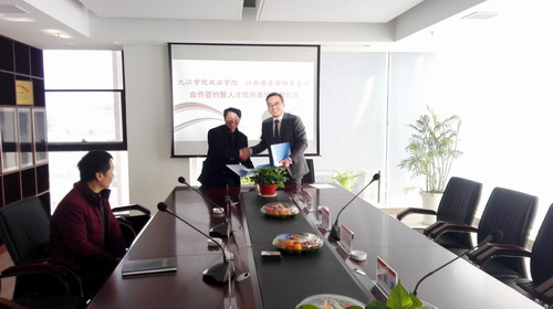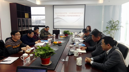为了落实地方性卓越法律人才的培养目标,实现地方高校社会服务的功能和价值,促进和深化与律师事务所在人才培养、理论培训、实务研讨等方面的合作,3月1日上午,政法学院与江西柴桑律师事务所联合举行了合作共建签约仪式暨卓越法律人才协同培养基地揭牌仪式。政法学院詹建志院长、宛锦春副院长、曹钟安副院长,实验室主任钟文红、副主任陈昊;柴桑律师事务所主任刘晖,副主任简武、周立斌,高级合伙人田玮琅、张立陶、沈峰、潘敏等参加了仪式。