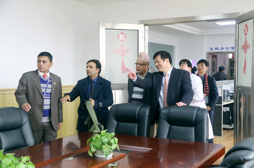 上午8:30,临床医学院/附属医院举行了隆重的欢迎仪式,该院端庄的礼仪小姐给外宾们献上了鲜花,Upendra校长一行给附院领导献上了象征友谊的羊毛围巾。在行政办公楼九楼会议室,外宾们观看了该院的宣传片。张志平院长作了热情洋溢的致辞,张院长对各位远道而来的客人表示热烈欢迎,并简要介绍了附院的历史渊源及发展现状。张院长说,尼泊尔是世界三大宗教之一佛教的发源地,是我国的友好邻邦。临床医学院/附属医院有11名尼泊尔留学生在这里进行临床医学实习,我们尽量为其提供良好的学习和生活环境,希望他们早日学有所成。希望通过此次交流,我们进一步加深沟通交流,增进彼此友谊,拓宽合作渠道,实现共同发展,推动我们的教育事业更上一层楼。