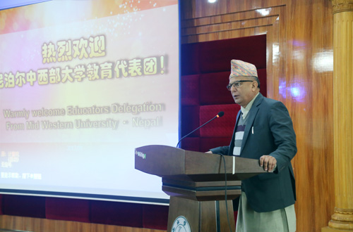 尼泊尔中西部大学执行校长Upendra也代表尼泊尔中西部大学作了致词,他对临床医学院/附属医院的热情接待表示衷心感谢,希望双方日后在学术交流、医学教育等方面开展广泛的合作。Upendra校长对在临床医学院/附属医院实习的留学生提出了殷切希望,他说,在座的留学生们来到中国,他们的身份不仅仅是学生,更是尼泊尔的形象大使,希望他们在九江学院临床医学院/附属医院扎实学好中国的先进医学知识。