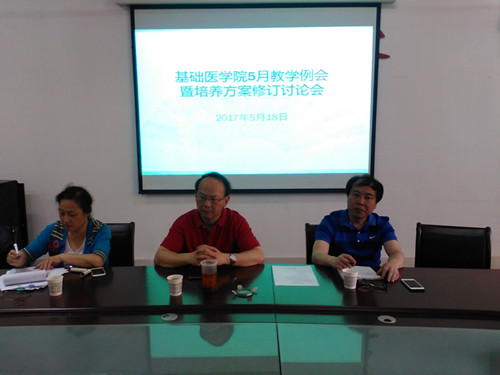 5月18日下午,基础医学院在华文楼105实验室召开5月份教学例会暨培养方案修订讨论会。基础医学院院长车向新、党委书记余朝阳、副院长郑美蓉、教研科、实验中心负责人和各教研室主任参加本次会议,会议由教研科科长牛力主持。