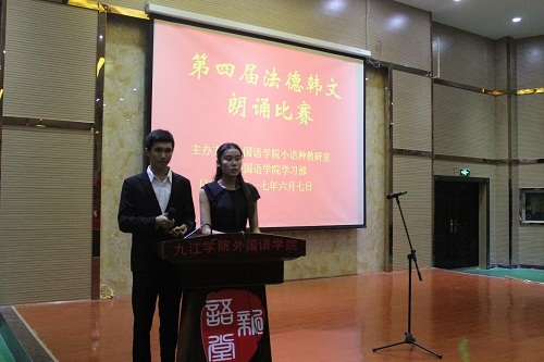 为了贯彻落实“一二七计划”,提高学生的专业素养,外国语学院于6月7日晚在香远楼三楼报告厅举办了第四届法徳韩文朗诵比赛,此次比赛由外国语学院小语种教研室主办,学习部承办,有兴趣的同学到场观看。