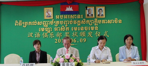 6月9日上午,柬埔寨王家研究院孔子学院和柬埔寨加华银行合作的中文俱乐部第一期汉语班结束,为感谢柬埔寨王家研究院孔子学院的支持,加华银行在加华大厦20楼培训室隆重举行颁奖仪式。加华综合企业集团董事长、柬华理事总会会长方侨生勋爵(Pu Khear Se)、Mega资产管理公司总经理林丽珍(Lim Lychen)、Mega资产管理公司招聘主管林健安(Lim Kear An)、柬埔寨王家研究院孔子学院公派教师邢慧莹、朱云云老师及25名加华银行中文俱乐部的学员参加了颁奖仪式。