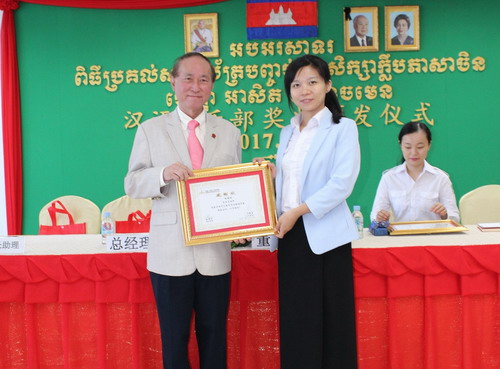 方侨生董事长(Pu Khear Se)在颁奖仪式中致辞,他指出,中国政府推行的“一带一路”政策将惠及柬埔寨的发展。纵观柬埔寨和加华银行的发展历史,加华银行离不开中文人才,中文教育对加华银行非常重要。随后,方董事长为柬埔寨孔子学院及在此任课的邢慧莹、朱云云两位老师颁发了证书和奖品,以此感谢柬埔寨孔子学院对加华银行中文教学的大力支持,并感谢两位老师的辛勤工作,他希望和柬埔寨孔子学院保持长期合作。