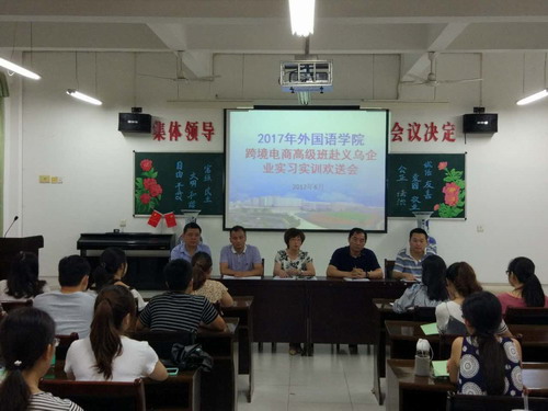 6月22日下午,外国语学院在香远楼315室召开PUP跨境电商高级班赴义乌实习实训欢送会,外国语学院院长韩琨、党委书记杨杰、副书记彭晓、教务科科长王伟、学生科科长吴章义及PUE高级班全体学生参加了欢送会,会议由外国语学院教务科科长王伟主持。