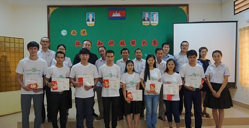 经过激烈的角逐,汉语中心的谢金莲(KEO Sophea)和符珍恩(HOUR Kimoeung)两位同学赢得了一等奖。高吴提校长为她们颁发了获奖证书与奖金。