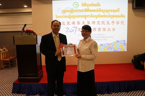 2017年7月24-25日,柬埔寨王家研究院孔子学院2016-2017年度外派教师和志愿者教师欢送会分别在暹粒省和金边市举行。中国驻柬埔寨大使馆参赞李杰、柬埔寨王家研究院院长克洛媞达(KHLOT Thyda)、副院长宋春文(SUM Chhumbun)、暹粒省教育厅副厅长洪万钠(HONG Upbolvanna)、柬埔寨孔子学院院长谢莫尼勒(CHEA Munyrith)、中方院长夏修龙以及全体汉语教师参加了欢送会。