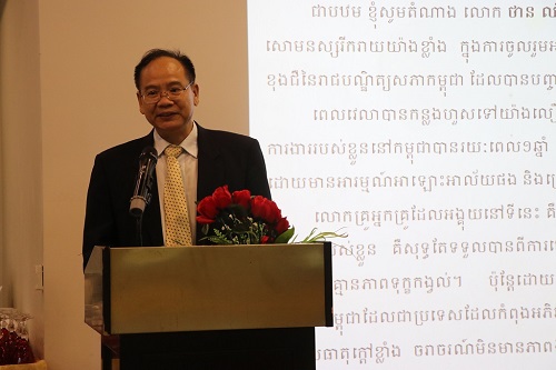 欢送会上,李杰参赞致辞,他感谢教师们的辛勤付出。他说,各位汉语教师克服难以想象的困难,在经济条件欠发达的柬埔寨传授汉语知识,传播中华文化,让成千上万的柬埔寨民众受益。他赞扬老师们用青春、热情、智慧乃至生命谱写一首首动人的中柬友谊诗篇,使中国语言文化在柬埔寨落地生根。
