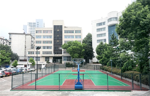 新建篮球场位于教学楼和临床技能中心前,以现浇混凝土找平抬高场地,地坪漆铺面,并加装防护网和高亮卤素灯,是一个标准化的户外球场。球场全天开放,灯光进行定时管理,集合了篮球场和羽毛球场双用功能,可用于正规比赛。