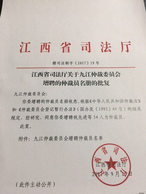 根据江西省司法厅赣司法制字(2017)19号文件的批复,我校政法学院的宛锦春、曹钟安、李德恩、李军政、汪旭鹏等五名法学专业教师増聘为九江仲裁委员会仲裁员。