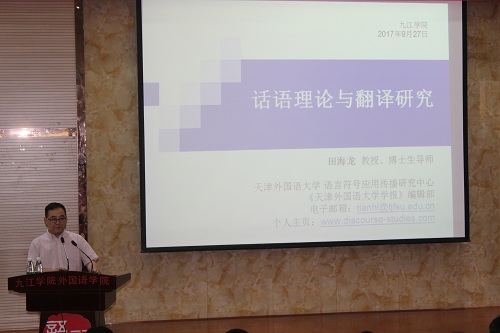 9月27日下午,天津外国语大学田海龙教授应外国语学院邀请,为我院全体教师和部分高年级本科学生作了题为“话语理论与翻译研究”的学术报告。报告在香远楼报告厅举行,由国学译馆负责人外国语学院桑龙扬教授主持。