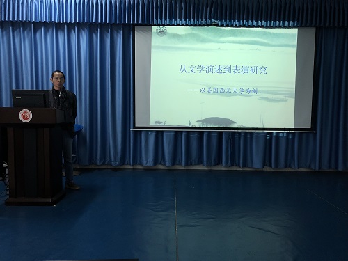陈建军博士赴美国西北大学留学归来,是文传学院首位获得国家公派留学项目的青年博士教师。其从美国西北大学表演研究的转向、表演特色、学生培养等具体方面,向大家介绍了其赴美期间的学习成果。陈建军博士在文学表演上的学术思考及成果受到了学术界广泛关注。