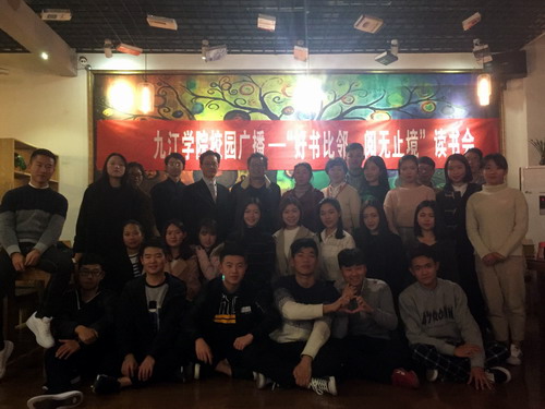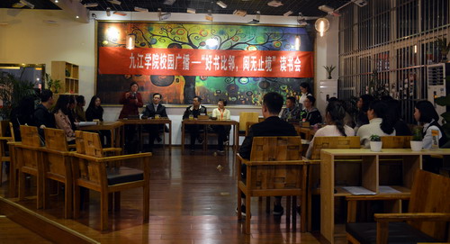 倡导全员读书,点燃读书激情,焕发青春活力,享受阅读快乐,共建书香校园。正值2017年“读书月”,九江学院校广播站积极开展了“读好书,好读书”系列活动,为推动读书活动的成效,为构建书香校园贡献一份力量,11月23日晚,校广播站在厚德楼一楼举办了“好书比邻,阅无止境”读书会。党委宣传部副部长何桂林,普通话水平中心的傅江宏老师、文传学院廖晓峰老师以及党委宣传部李晓云老师参与本次活动,与大家一同在书海中畅游。