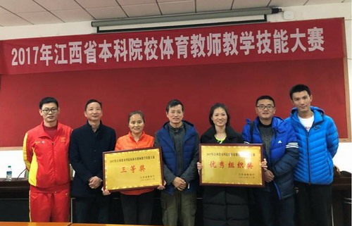 在刚刚结束的2017年江西省本科院校体育教师教学技能大赛上,我校体育教师代表队在校领导和院领导的关怀与支持下,经过刻苦训练、艰难拼搏,终于获得团体三等奖、优秀组织奖;2个个人二等奖,5个三等奖的优良成绩。