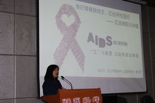 宣讲活动中,九江市艾滋病防治所黄文军所长首先从学习与身体的关系,讲到了艾滋病对青少年健康的危害。她从艾滋病目前的流行动态、传播途径、防控措施等三个方面详细介绍了艾滋病的传播过程和严重危害,并通过自己在工作过程中遇到的详实事例讲解了艾滋病对自身、家庭和社会的种种危害,尤其是近年来男男同性恋导致的艾滋病感染率呈快速增长趋势,要同学们务必清醒的认识到艾滋病也许就在你我的身边这一活生生的现实,希望大家要提高自我保护意识、洁身自好,并主动担当起艾滋病的义务宣传员。