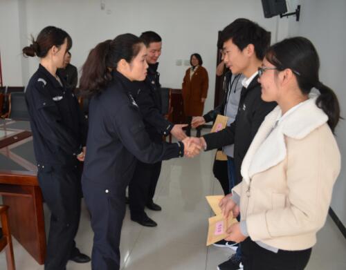 自2015年以来,九江市八里湖新区公安分局的领导与干警们以“校警共建”合作交流为平台,以献爱心的方式资助九江学院八里湖校区部分贫困学生。12月20日上午,九江市八里湖新区公安分局党委委员、副局长胡剑芸、团委书记柯晶、指挥中心副主任龚琛一行走访八里湖校区,并现场资助了校区部分贫困学生。八里湖校区管理办书记邓燕、校区学生科,政法、体育学院学生科负责人及受资助学生代表热情接待了胡副局长一行。