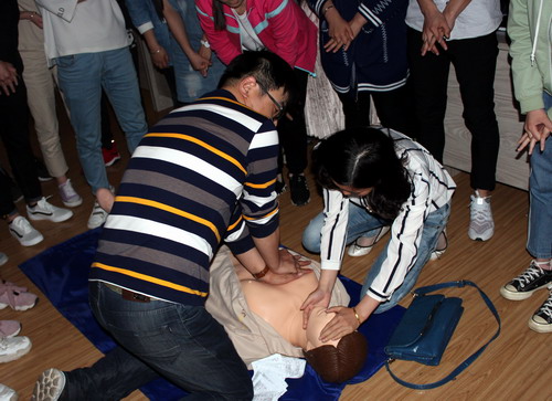 本次培训旨在提高师生在突发事件和意外伤害中的应急处置水平及自救互救能力,能在120医生赶到之前为需要急救的患者实施正确的心肺复苏术等现场抢救措施。讲座中,钱逢鑫、高蕾老师采用理论讲授、操作讲解、实践操作相结合的方式,详细讲授了常见意外及突发事件的处理、单人徒手心肺复苏操作流程、创伤救护的现场急救处理及相关的实用急救知识症与突发伤害救护等基本知识和基本救护技能,尤其在心肺复苏救护操作课上,详细讲解了心脏复苏术的重要性以及实施的主要步骤以及成人、婴幼儿等气道异物梗阻的急救方法进行了讲解和演示。心肺复苏救护操作上,学员们踊跃参加,现场模拟演示了胸外按压以及口对口人工呼吸的具体操作等急救技术,现场进行互动,通过亲自操作人体模型,进一步巩固了所学知识,掌握了现场急救的基本技能。