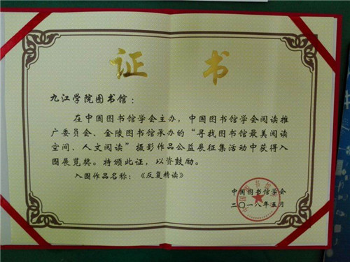 在本次年会“寻找图书馆最美阅读空间、人文阅读”摄影作品公益展主题活动中,我校推荐的摄影作品《反复精读》(作者余翠利)荣获入围展览奖。本次活动共设置了组织奖和入围展览奖两个奖项。