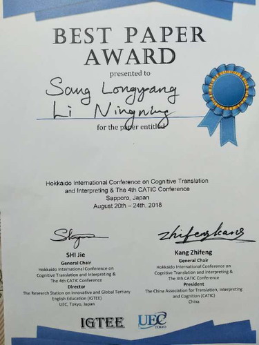 经过几天的紧张研讨,此次会议圆满落幕。在闭幕式上康志峰会长为最佳发言论文奖、最佳鼓励奖、最佳学生(博士生)发言论文奖获得者颁奖;桑龙扬教授与李宁宁教授合作的论文获得最佳论文奖。会议向桑龙扬教授颁发了中国翻译认知研究会常务理事证书。随后举行了九江学院赠书仪式。桑龙扬教授向来自美国和日本的外籍专家赠送了《<论语>的公理化诠释》中英文对照版和中日文对照版、《<孟子>的公理化诠释》中英文对照版。