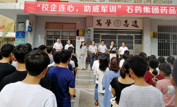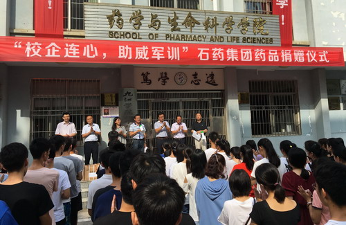 石药集团作为药生学院的实习、见习基地,双方合作关系融洽,在得知2018级新生即将进行军训,需要防中暑药品,9月6日上午9点,石药集团在心远楼前给药生学院新生捐赠了藿香正气水等防中暑药品。药生学院新生代表参加本次捐赠仪式,石药集团董事长杨栋、副总理邓胜和学院党委鲍海鸥书记,副院长张小谷、王春娥、余敬谋,院长助理吴家忠、学生科科长徐常龙及部分辅导员班主任出席本次捐赠仪式,仪式由张小谷副院长主持。