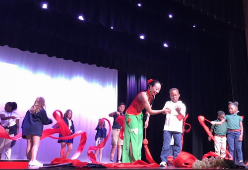 当天上午,来自萨凡纳市查特姆学区( Chatham )的八所中小学师生共计四百余人齐聚艾伦高中(Islands High School),共同见证了“孔院日”庆典的欢乐时刻。不少学生还带上自制的中国国旗,场面十分欢悦。萨凡纳州立大学孔子学院外方院长佩吉·布拉德博士向师生介绍了孔子和孔子学院,然后带领大家兴致勃勃地观看了中国民族舞蹈表演。整场演出以中国少数民族文化习俗介绍和特色舞蹈表演穿插的方式进行,形式新颖独特,孩子们争相上台跟着演员学习孔雀舞、红绸舞,模仿得惟妙惟肖。