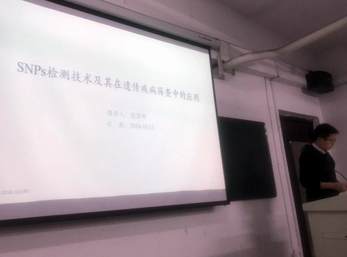 10月21日晚,基础医学院付登刚博士在浔东校区华文楼102教室作了题为《SNPs检测技术及其在遗传疾病筛查中的应用》的学术讲座,药理学教研室主任熊建军博士、社会医学与公共卫生学教研室副主任黄邵鑫博士及 2018级预防医学本科专业全体学生参加了本次讲座。
