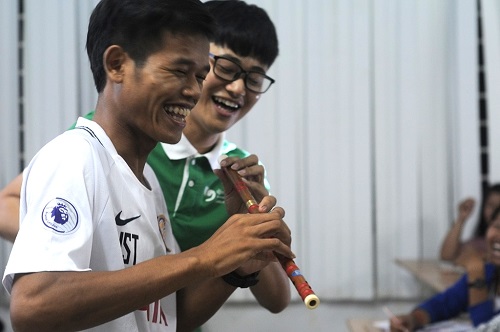 姚金水老师则向学生们介绍了中国的传统音乐。姚老师首先播放了柬埔寨的传统音乐,又给学生们听了中国名曲——-二胡独奏《赛马》、葫芦丝演奏《月光下的凤尾竹》和古筝独奏《渔舟唱晚》等。接着,姚老师简单介绍了中国的传统乐器笛子、葫芦丝和古筝,并现场为学生们吹奏了笛子和葫芦丝。