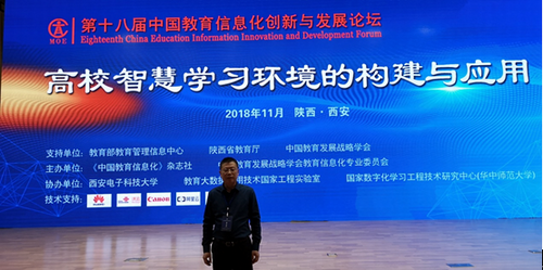 日前,以“融合创新 智能引领--构建2.0时代的教育新生态”为主题的第十八届中国教育信息化创新与发展论坛在陕西省西安市召开。论坛在教育部教育管理信息中心、陕西省教育厅、中国教育发展战略学会的指导下,由《中国教育信息化》杂志社、中国教育发展战略学会教育信息化专业委员会共同主办,西安电子科技大学、教育大数据应用技术国家工程实验室、国家数字化学习工程技术研究中心(华中师范大学)协办。来自全国各地的教育信息化领域专家和学者、教育行政部门主管领导、各省教育厅信息中心主任、学校校长和信息化管理者、信息技术教师、广大教育工作者和企业代表等2000余人齐聚一堂,共同探讨教育信息化2.0的发展路径。我校信息技术中心梅龙宝教授参加了本次论坛和观摩活动,并参观学习西安交通大学智能机器人创新研究院。
