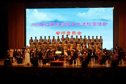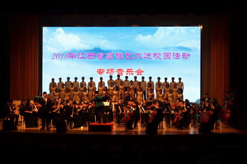 晚上7点,艺术团师生不辞辛苦赶到景德镇陶瓷大学,在该校艺术活动中心举行了专场音乐会,三百多个座位座无虚席。师生们以饱满热情的演奏和深情的演唱再次得到了在坐观看学生们的一致好评。本场演出后,本年度我校2018度江西省高雅艺术进校园活动圆满落下帷幕。