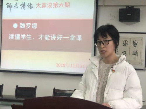 短短一年多时间,从学生到老师的角色转换,带给我很多感悟:老师教授学生,学生也在时时激发老师的“头脑风暴”,这就是所谓的教学相长吧。而老师和学生之间有效沟通的前提,在于是否互相理解。作为班主任,我曾在做一个后进学生的思想工作时意外地发现,即使是一名后进学生,对人生也有自己的愿景、期望和规划,并不像我们想的那样只是一味的浑浑度日。这件事再次启发我、提醒我,不管是在教学中还是在沟通交流中,都不能用定式思维思考问题,而要有意识地强化以学生为中心的平等、服务的心态,把每个学生都当成一本书,认真地阅读,尽可能读懂学生,理解学生。只有这样,我们的课,才有可能讲得好,讲得受学生欢迎,讲得让学生学到东西。