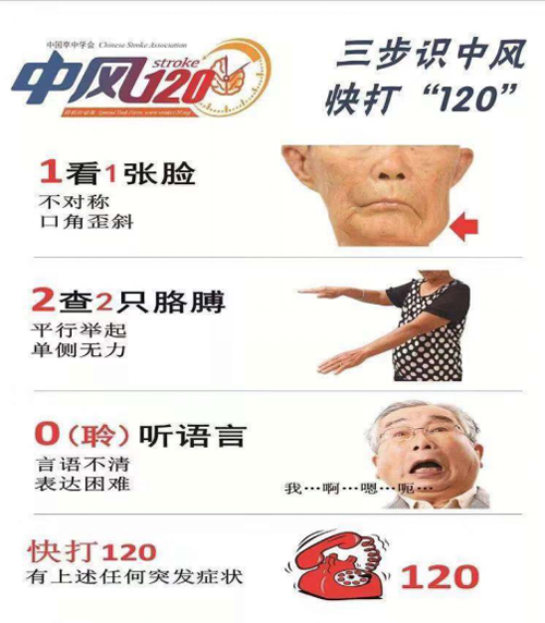 中国卒中学会专家的建议:快速识别脑中风应牢记“中风1-2-0”——“1:看到一张不对称的脸。2:查两只手臂是否有单侧无力。0:聆听讲话是否清晰”。若出现上述任何症状(俗称脑中风),应立刻拨打电话急救“120”。