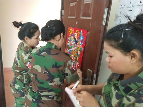 当晚,金边警备旅孔子课堂教室充满了柬埔寨士兵的欢声笑语,士兵学生们每天都有繁忙的工作和训练,但仍然坚持学习汉语,十分踊跃地参与到此次春节文化体验活动中来,活动场面热闹非凡。活动由警备旅中方负责人魏来老师宣布开始,第一项内容是介绍春节传统文化习俗。魏老师指着白板上提前写好的新年祝福语,一边带领大家读、写,一边解释意思,各位同学听得十分投入,积极和老师互动,并认真地记下了笔记。