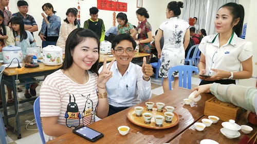 教学点的老师们精心布置了活动现场,用拉花、中国结、中国香囊、鞭炮、福字和对联装饰了教室,营造出了浓郁的节日氛围。此次文化活动共分为了五个板块,PPT宣讲,茶艺表演,学写毛笔字,品尝中国传统美食和做游戏抽奖。