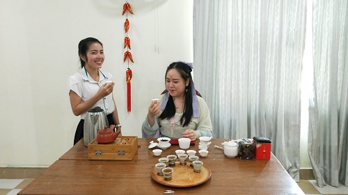 马俊秀老师则身穿汉服,为学员们表演了茶艺。《高山流水》的音乐声里,但闻茶香袅袅,似山中雨后初绽的鲜花撩人心房。一湖春雨涨春池,高山流水有知音,茶之道,不仅生津止渴,更是指引人们修身养性,品味人生。聆听讲解后,学员们纷纷表示中国的茶文化真是博大精深。