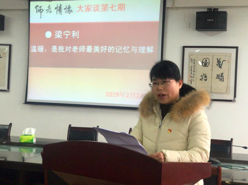 梁宁利老师讲述的题目是:《温暖,是我对老师最美好的记忆与理解》。她首先饱含深情地讲述了20多年前读乡村小学时一位老师给她带来的温暖的记忆。通过那次经历,她感悟到:原来,在老师一副严肃的面孔下,也藏着满满的温馨和慈爱,温暖着我们幼小的心灵,温暖着我从此以后的人生。接着,她又回忆了2005年九江地震时作为监考老师的经历。与她一同监考的男老师在灾难袭来之时的镇定、果敢,以及保护学生的应激反应给她留下了深刻的印象。她说:回过头来,那个男老师的名字我都不记得,长相也没有印象,但他在我和学生的心里却种下了一颗温暖的种子,让我们感动的同时,还让我们常常回忆并且愿意向他学习!那一瞬间,面临生死,考验人性,虽说最终无碍,但是,他以实际行动对老师这个称呼的诠释,让每一个学生以及知情的人感到了温暖。这次经历,让我更加愿意把老师的职业要求理解为:做一个温暖人心的人!这种理解当然不够全面,但是,至少应该是一种职业特征、职业素养吧。正是因为受到了温暖的感化,梁宁利老师常常问自己,作为老师,我应该怎样才能更好地温暖学生?十几年来的教学实践和带班实践,让她有了三点体会:第一,自己要有热度;第二,要深入学生生活;第三,要学会换位思考。她说:老师有了热度,才有可能把热度传递给学生。这种热度,最主要的是对教师职业的热情和对学生的真情,它会自然流露于与学生接触的点点滴滴。每个学生都能真切地感受到这种温暖。这种温暖,直接并且深刻地影响着学生的学习和生活。