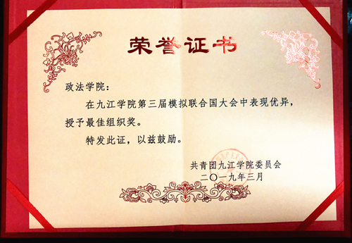 3月22日至24日,九江学院第三届模拟联合国大会在主校区逸夫报告厅隆重举行,此次模拟联合国大会共二十五个国家代表队五十名代表参会,设有三个最佳组织奖,八项个人奖。政法学院代表其中五个国家,共出席十位代表,斩获一项最佳组织奖与四项个人奖。