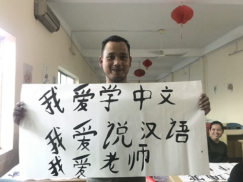 比赛开始时,初习汉语的同学们一时不知道写什么好,魏来老师便结合最近刚刚结束的中柬两国“金龙”演习,在黑板上写下“我爱中国,我爱柬埔寨”,作为统一赛题。
