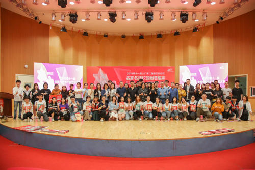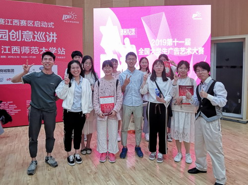 5月10日下午,文传学院老师程荣荣、夏勤喜带领21名学生赴江西师范大学瑶湖校区,参加第十一届大广赛江西赛区启动仪式暨名家名师校园创意巡讲活动。