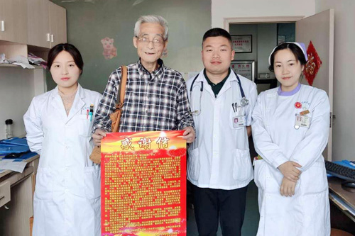 患者吴婆婆,81岁,之前曾在外院进行治疗,出院后不久出现胸闷、头晕、乏力等不适,后来到临床医学院/附属医院就诊。患者既往诊断为2型糖尿病伴多个并发症,合并肾功能不全,入院时查血钾:7.76mmol/L,脑钠素:856.81pg/mL,考虑患者合并心功能不全及肺部感染,在告知患者及家属病情危重的同时,附内分泌科主任虞建新、副主任医师董俊、医师曹文娟等立即给予抗感染、利尿纠正心功能不全、胰岛素配葡萄糖降血钾等综合处理,将患者病情逐渐控制平稳。治疗效果显著,出院当天,患者及其儿子送来一面锦旗,以表对科医护人员的感激之情。