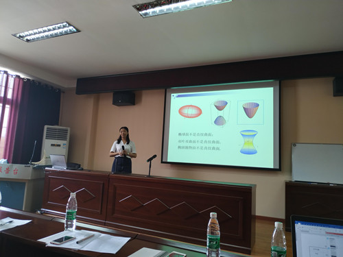 随后,桂国祥老师以此次国赛的其中一个授课节段“双曲抛物面”为例,进行了20分钟的教学展示。教学中,桂老师将课本知识与实际生活相融合,通过精美的PPT演示、精心制作的教具展示以及严密的公式推导及计算,深入浅出的将本节知识一一呈现,让在座教师感受到了数学这种符号语言的独特魅力并陶醉其中。