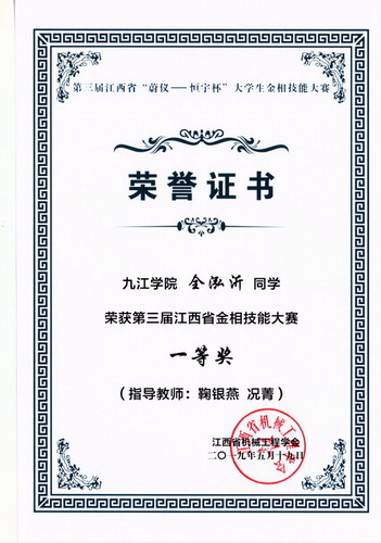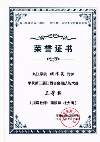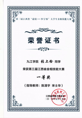 5月17日至19日,第三届“蔚仪—恒宇杯”江西省大学生金相技能大赛在南昌航空大学举行。经过校赛选拔、省赛的激烈争夺,我校参赛团队取得优异成绩,6名参赛同学全部获奖。其中2016级金属材料工程专业张上铨、全弘沂获一等奖,张浩、胡泽昊、刘咏慧和黎浩获三等奖,指导老师陈清宇、鞠银燕、宋士华和况菁获得优秀指导教师奖,我校还获得团体三等奖。