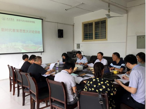 为认真学习贯彻习近平新时代中国特色社会主义思想,落实新时代全国高等学校本科教育工作会议精神,结合学校要求和学院实际工作,6月10日上午,药学与生命科学学院在心远楼413会议室召开新时代教育思想大讨论活动,学院党政领导、各科室负责人和教师代表参加,会议由余敬谋副院长主持。