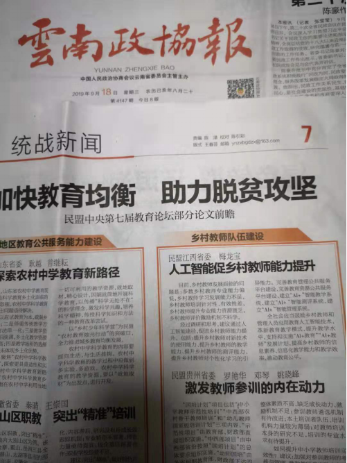 之前,《云南政协报》(2019年9月18日)刊登了梅龙宝教授《人工智能促乡村教师能力提升》的文章观点。